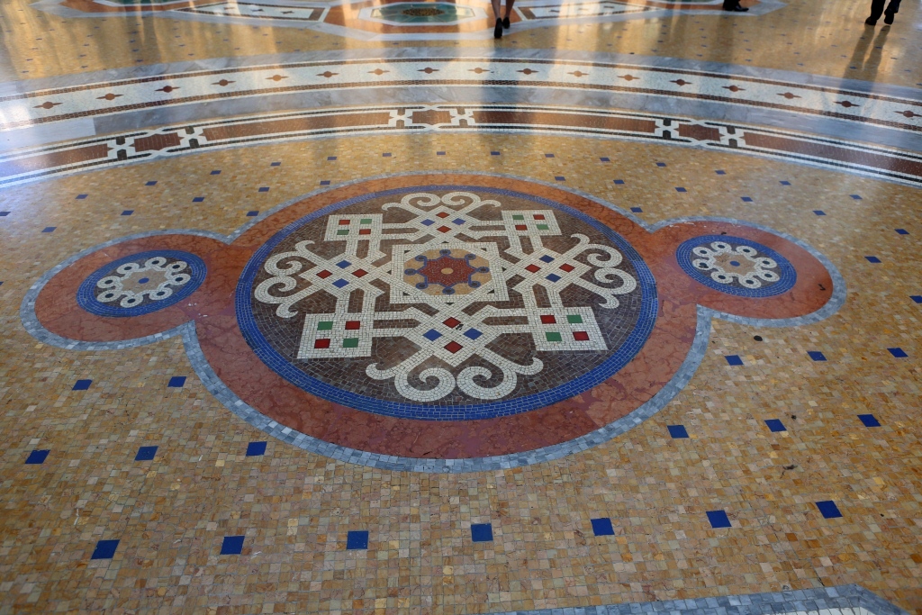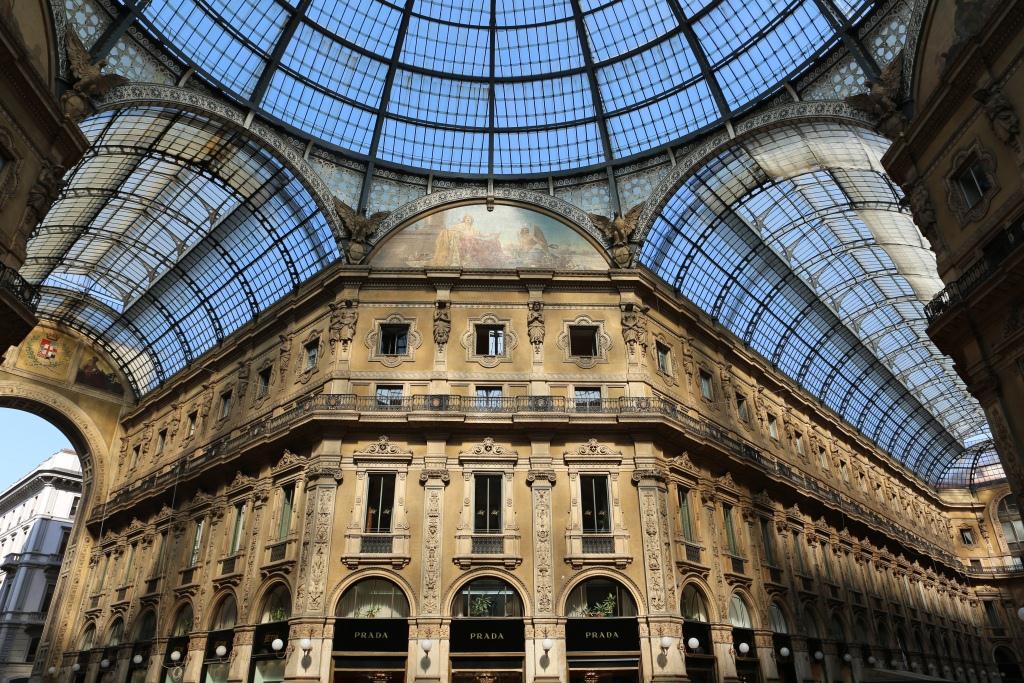 A portion of the interior of the Milan Galleria shopping area. It is open air and a wonderful place of shops, cafes, hotels, and businesses.