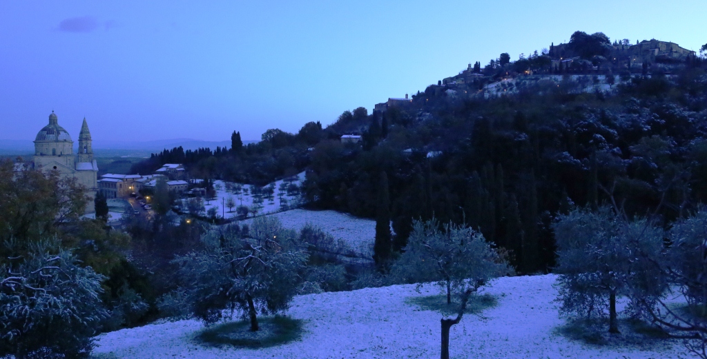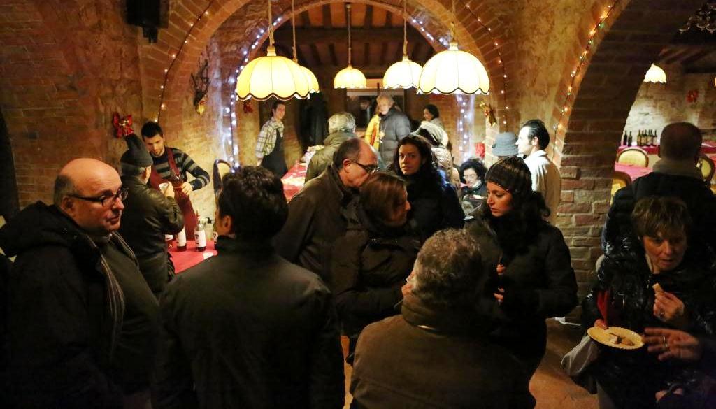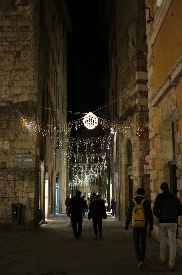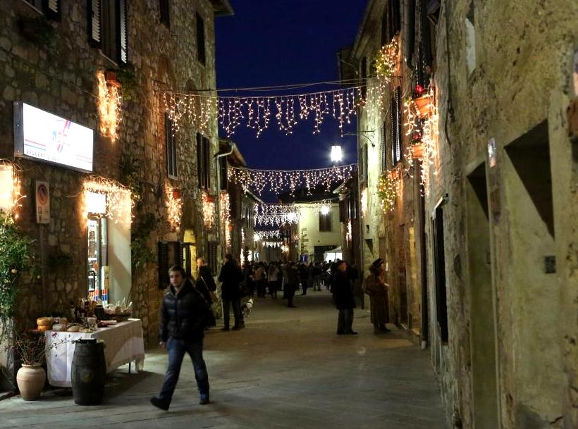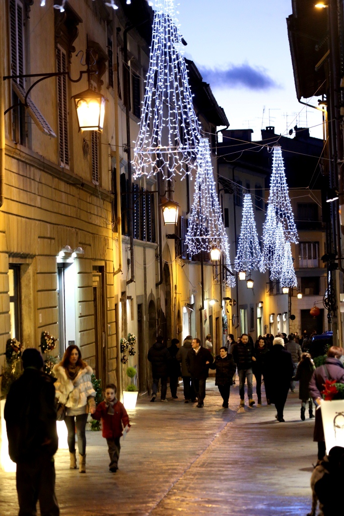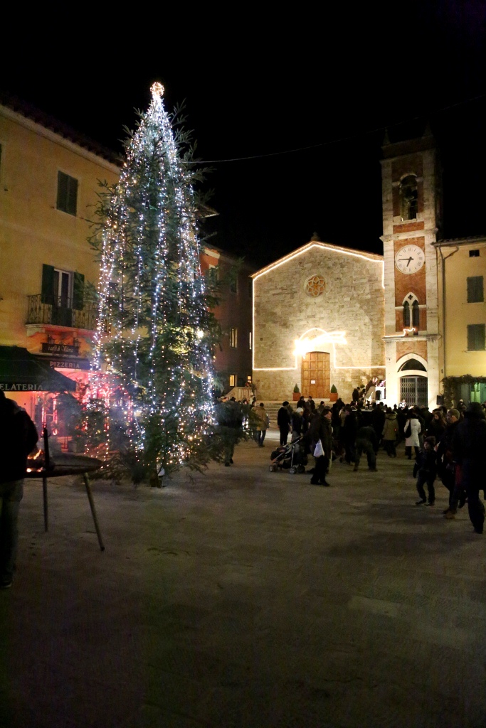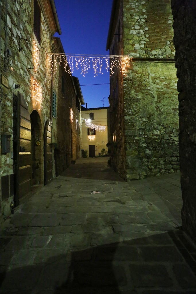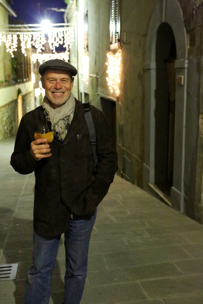 Montefollonico was having its annual Vin Santo festival to celebrate the making of this liquid of the gods, sweet dessert wine. If you have never tried some you are missing a real treat. They tend to be a bit on the expensive side for the bottle size but you are worth it! There were over a dozen small businesses and even people’s homes open for you to come in and they pour you a nice size “taste” at NO charge. Some of the old cellars under the houses and roads of the town were absolutely magical little places where you can only imagine how long the same sort of activity has occurred. Most of the tasting venues also have ‘cantuccini’ which are small almond flavored cookies that are classically served with the vin santo. The small Christmas lights in town were on and there was music along the main street in town. (There are only two streets in the old town.) We made our way around, did a good job of tasting and brought home three bottles. Now if they will just make it to Texas.