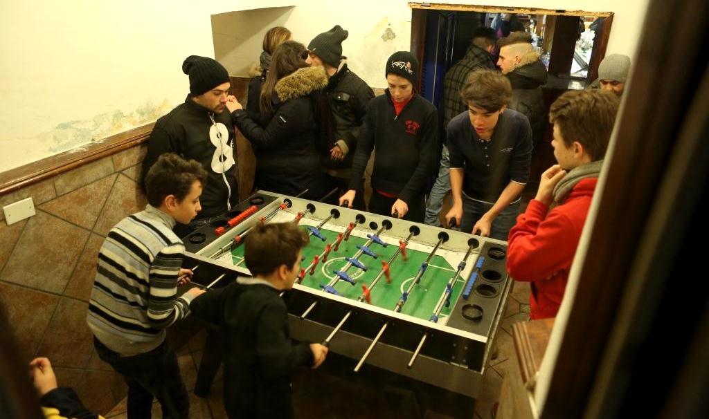 A serious game of foos ball was going on inside one of the buildings. I shot this looking in through the window from the sidewalk.